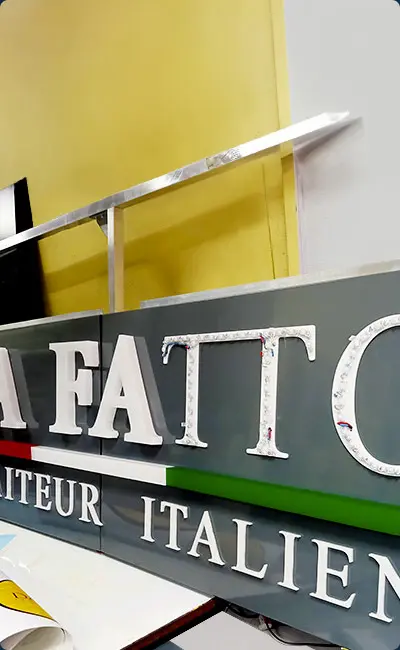 Nous réalisons tout ce qui tourne autour de l’univers de l’enseigne et de la communication. Dès lors, nous fabriquons et installons aussi bien des stores lumineux, des bâches, des caissons sur mesures.