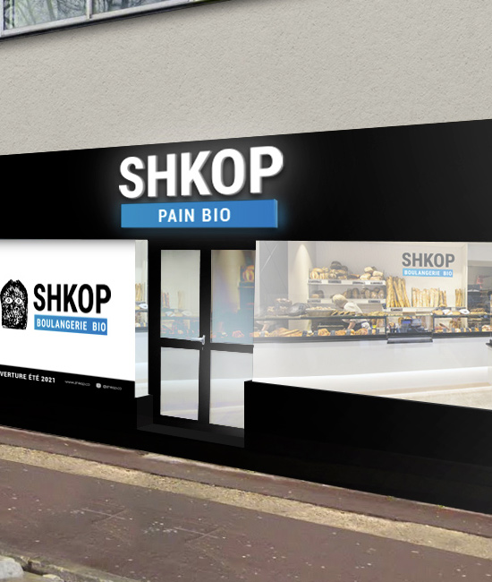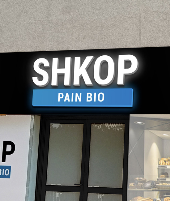La boulangerie « Shkop » située sur la commune de Charenton-le-Pont, avait pour projet d’installer une enseigne avec lettres lumineuses, caisson rétroéclairé et vitrophanie. Notre graphiste freelance partenaire à effectué des maquettes pour prévisualiser le(s) rendu(s) possible.  Le projet à nécessité une équipe de 3 personnes du fait de la longueur des panneaux et des adhésifs à poser.