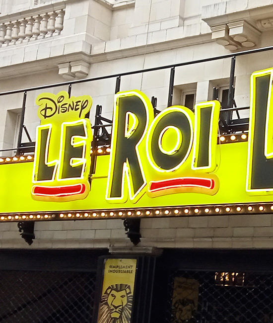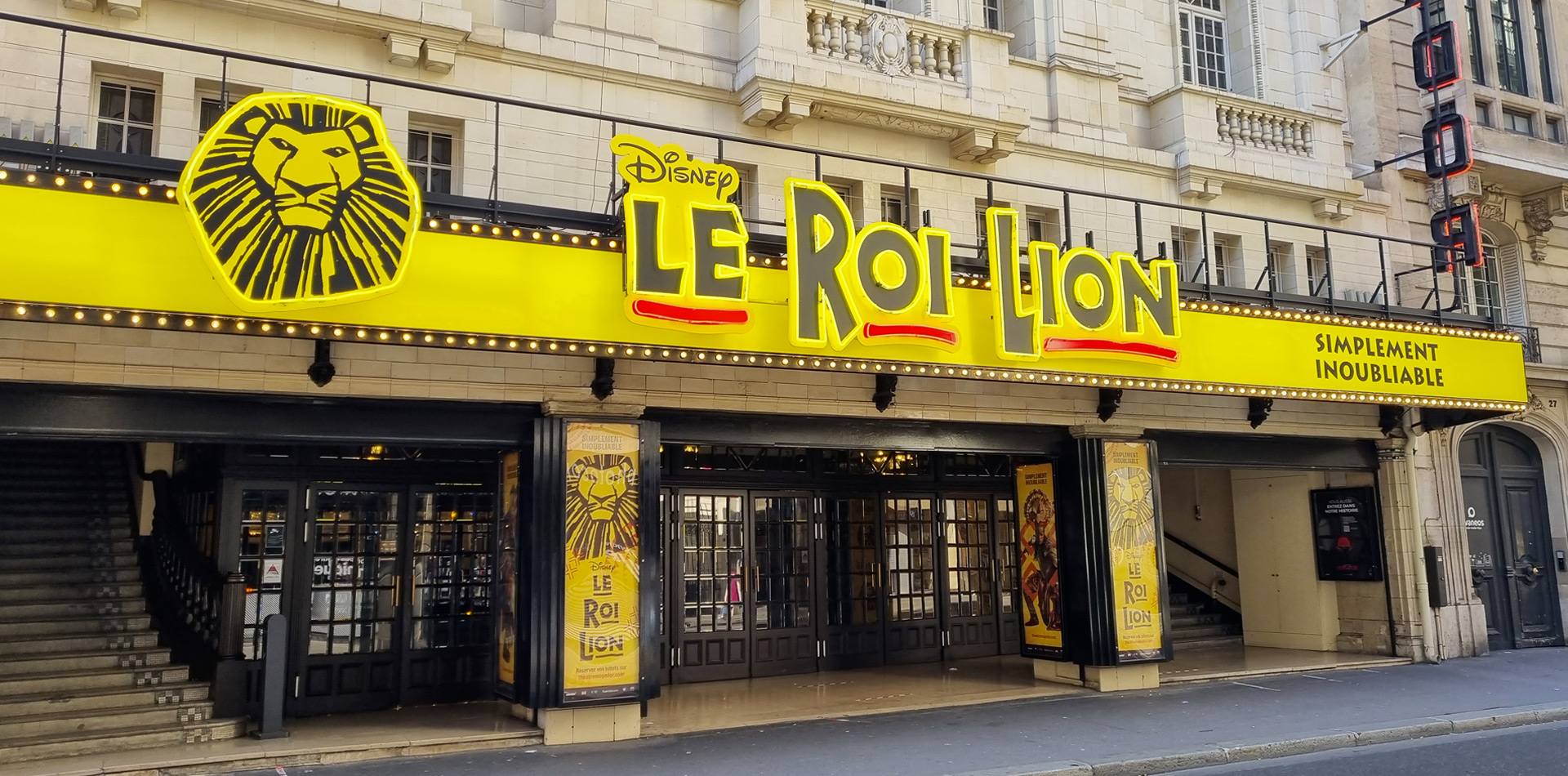 Le Théâtre Mogador situé au 25 Rue de Mogador, accueille la comédie musicale le Roi Lion. L’enseigne de + de 20m de long est composée de + de 250 d’ampoules, d’un cCaisson avec bâche lumineux, des lettre découpées en PVC de 20mm, un contour de texte en néon, ainsi qu’un fond/bandeau lumineux avec éclairage interne en LED ainsi.