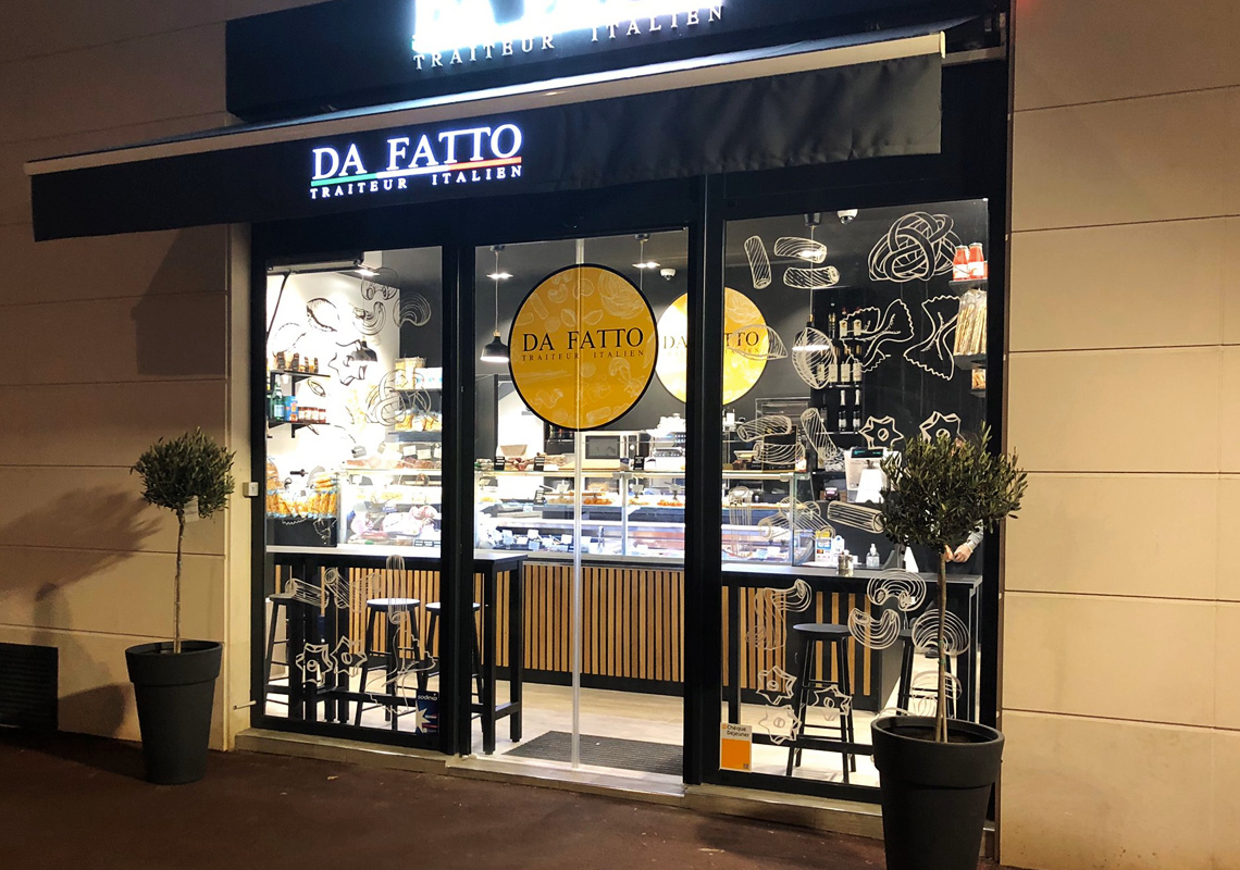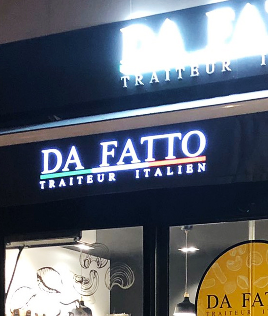 Traiteur Italien, basé à Joinville le Pont, l’enseigne Da Fatto avait plusieurs projets : lettres lumineuses, store avec lambrequin lumineux. Nous avons opté pour des blocs LED en plexi diffusant.